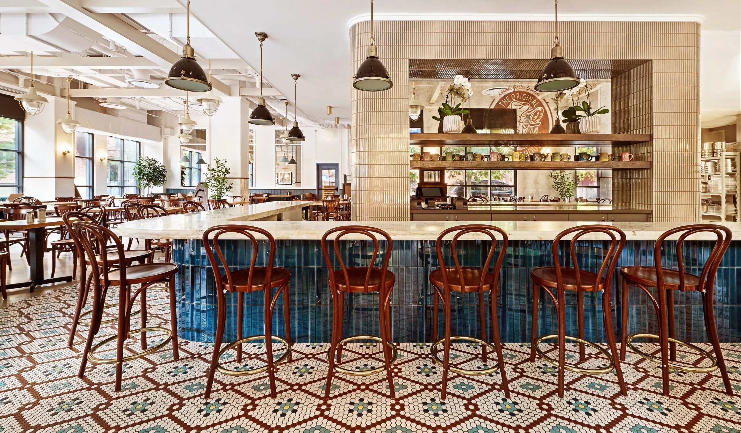 This project centers on creating a vibrant new breakfast destination. Timeless yet energizing, designed to reflect the family’s next generation as The Original Pancake House expands into Chicago’s West Loop. Transforming an unfinished concrete shell, the design introduces a warm and welcoming atmosphere defined by natural light, rich wood tones, and bright, reflective blue tiles that bring a sunny, uplifting feel to the space. A thoughtful balance of warmth and vibrancy guides the interior. Generous daylighting, paired with bold tile accents and strategic mirror placement, amplifies brightness throughout the dining room, making it feel like a true morning haven. At the heart of the space, the coffee bar acts as a lively central hub. Set within a custom mosaic floor, it greets guests upon entry and seamlessly connects the kitchen to both wings of the dining area. Outdoors, lush planters and cheerful awnings bring the concept to the street, establishing a confident and inviting presence on a prominent corner. The result is a fresh, sunny breakfast spot that honors a beloved brand while embracing the family’s next generation of hospitality.